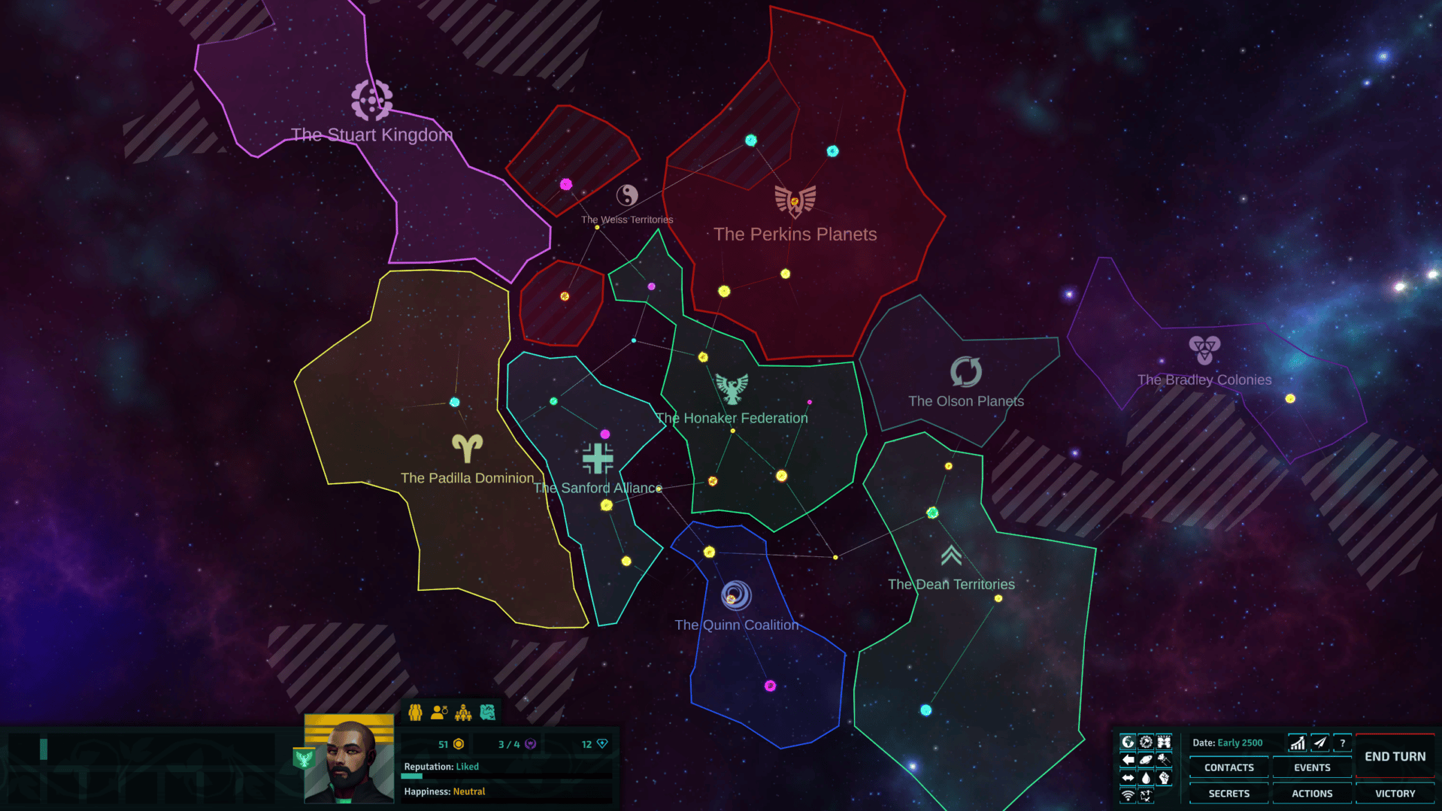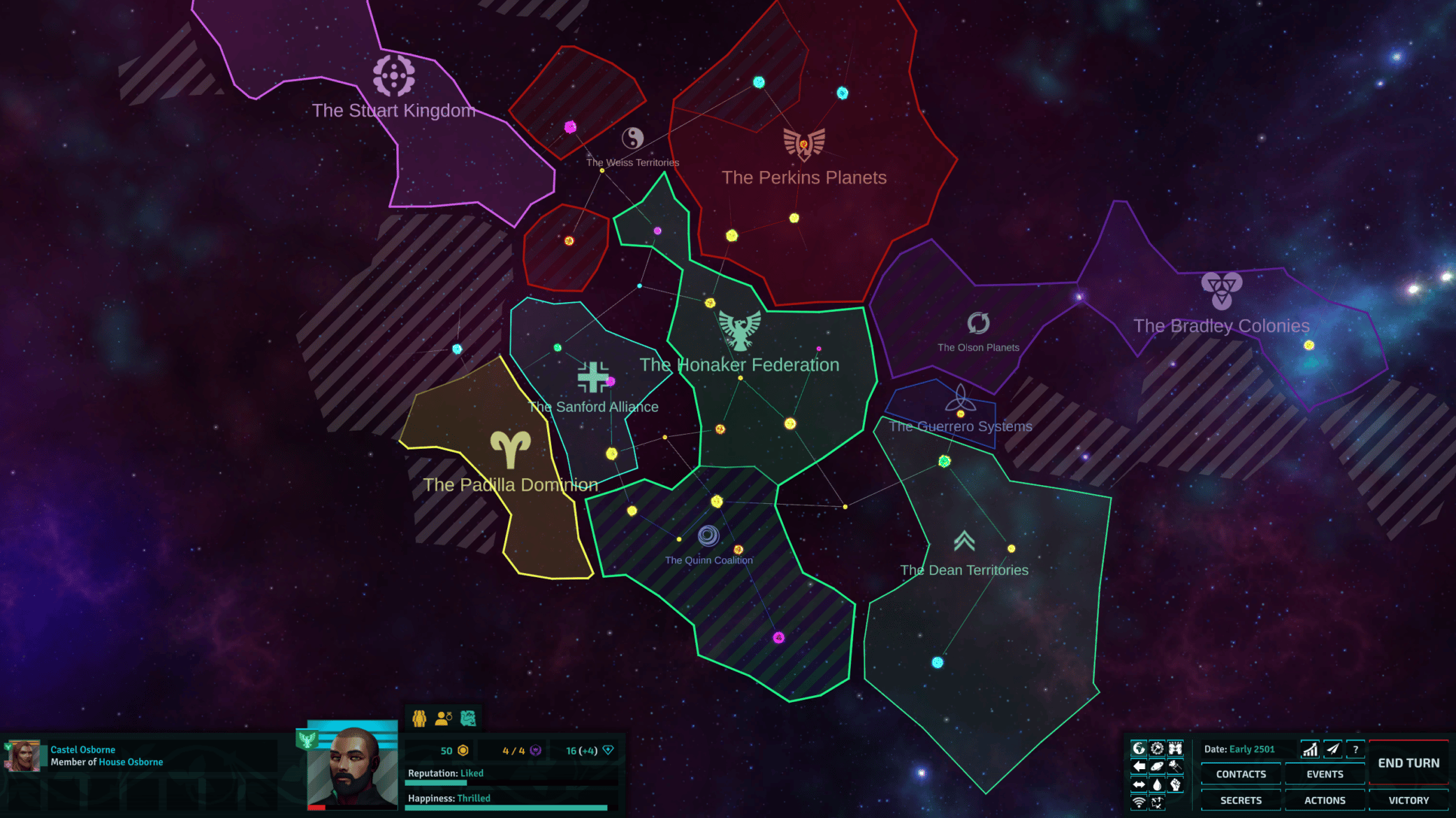 Essentially, the Quinn Coalition joined my federation, doubling my size, and I had zero part to play in it. While I appreciate randomness in character-driven games like this, I want to feel like I’ve earned such dramatic additions to my empire. Instead, the Quinn Coalition offered to become my vassal for no apparent reason, and of course, I said yes.